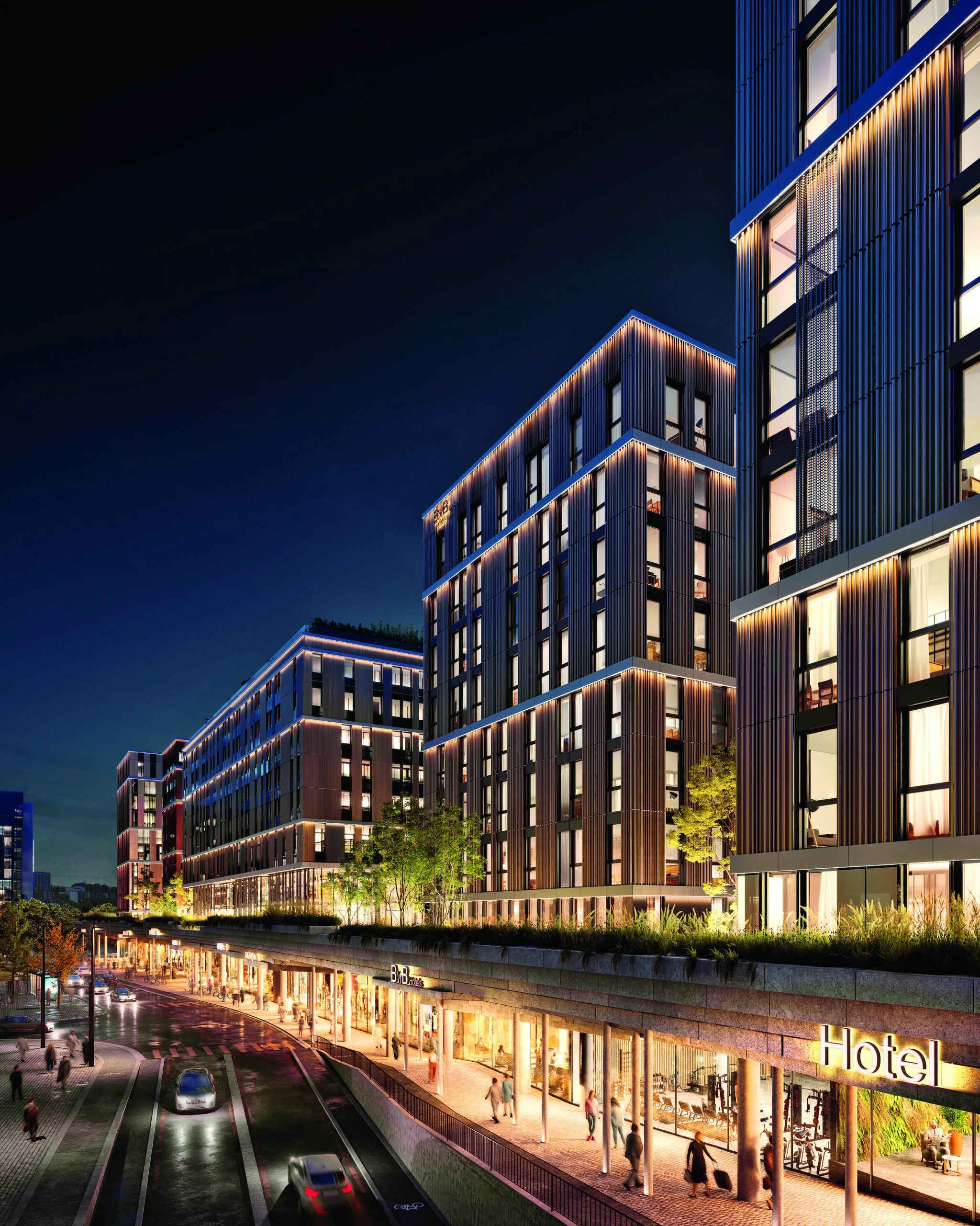 Le cœur de l’ilot contiendra une galerie commerciale sur 2 niveaux (lots de 70 à 2’000 m2) ainsi qu’un vaste atrium qui connectera l’ensemble des galeries aux larges terrasses où s’invitera la végétation verdoyante de jardins suspendus.