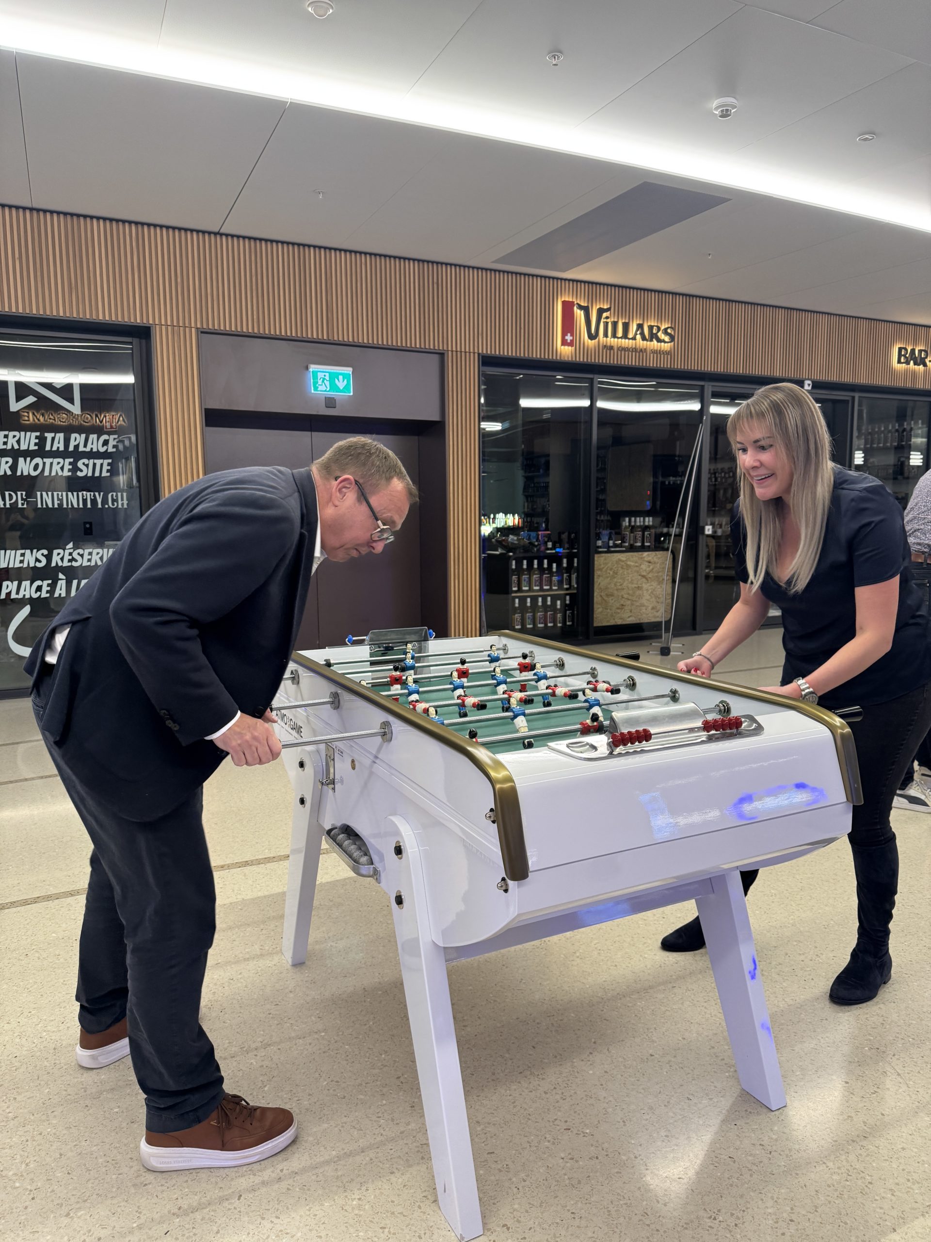 Lors d’un afterwork chez Ferrari, Xavier Jeanneret et Céline Dessimoz se retrouvent… Le ton est donné, le pari est lancé : un tournoi de baby-foot pour départager les deux équipes !